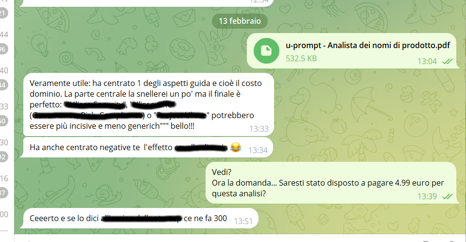 La sua risposta è stata la migliore validazione possibile: non solo ha trovato l’analisi incredibilmente centrata — evidenziando aspetti critici come il costo del dominio o l’efficacia psicologica del nome — ma alla mia domanda provocatoria “Saresti stato disposto a pagare 4,99€ per questo?”, la risposta è stata un secco: “Ceeerto!”