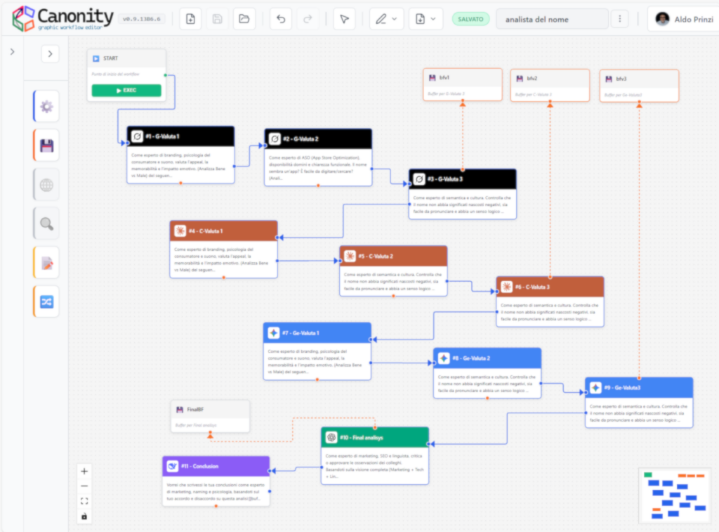 Per realizzare questa analisi, ho aperto Canonity, il nostro editor grafico di step-prompt e ho strutturato il lavoro in tre passaggi fondamentali:
